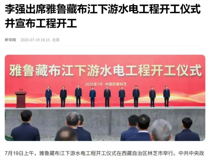 Проект гидроэлектростанции на нижнем течении Ярлунг Цангпо — это мегапроект, реализуемый Китаем в городе Нинчи, Тибетский автономный район. 19 июля премьер Государственного совета Ли Цян принял участие в церемонии запуска проекта и официально объявил о его начале. Проект предусматривает выпрямление изгибов реки и направление воды через туннели, а также строительство пяти каскадных электростанций с общим объемом инвестиций около 1,2 трлн юаней.