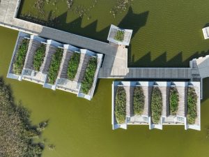 С высоты здание выглядит как фрагмент природной долины, «вырезанный» из ландшафта. Волнующиеся камыши, извилистая деревянная тропа, морская дамба и бескрайние просторы создают эффект погружения в живую картину. Природа и архитектура здесь не противопоставлены, а сливаются в единую композицию.