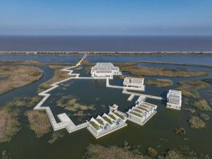 Учитывая солёность и влажность климата, архитекторы отказались от дерева и лёгких стальных конструкций, выбрав долговечный и устойчивый железобетон. Для минимизации воздействия на экосистему, здания разместили как водный посёлок – пять разнесённых объёмов соединены извилистым деревянным мостом, создающим видовую перспективу и единую пешеходную траекторию.